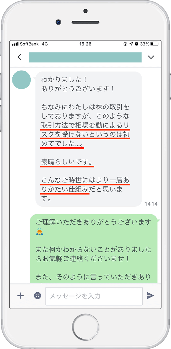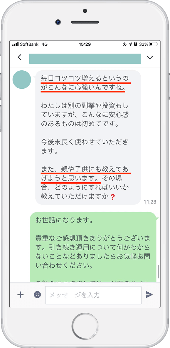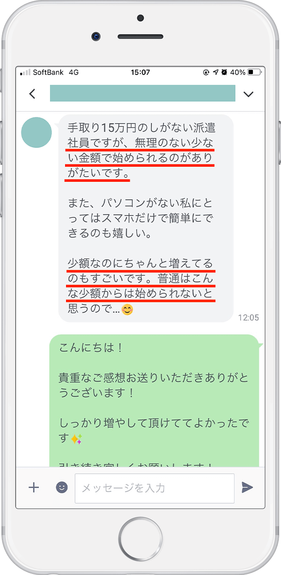 分からないことはLINEチャットで365日サポート。口座開設から運用後のサポートまでしっかりとさせて頂くので、初心者の方や老若男女問わず、安心して資産を増やしていける環境となっています。